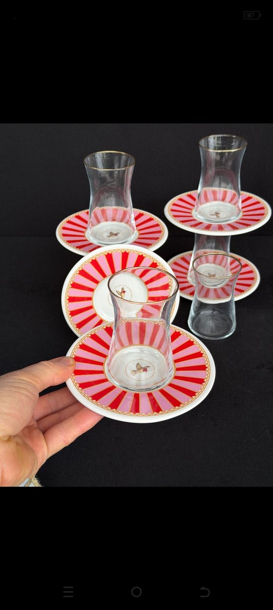 Altın detaylı, kırmızı ve beyaz desenli altlıklara sahip 6 adet şeffaf çay bardağı seti. Renkli ve şık bir sunum sağlar. PTT kargo MNG kargo