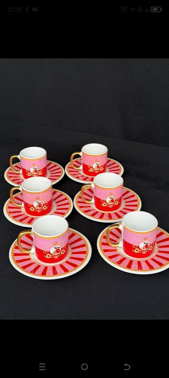 Altın saplı, pembe ve kırmızı çizgili, çiçek desenli 6'lı kahve fincanı ve tabağı seti. ☕ ptt kargo MNG kargo