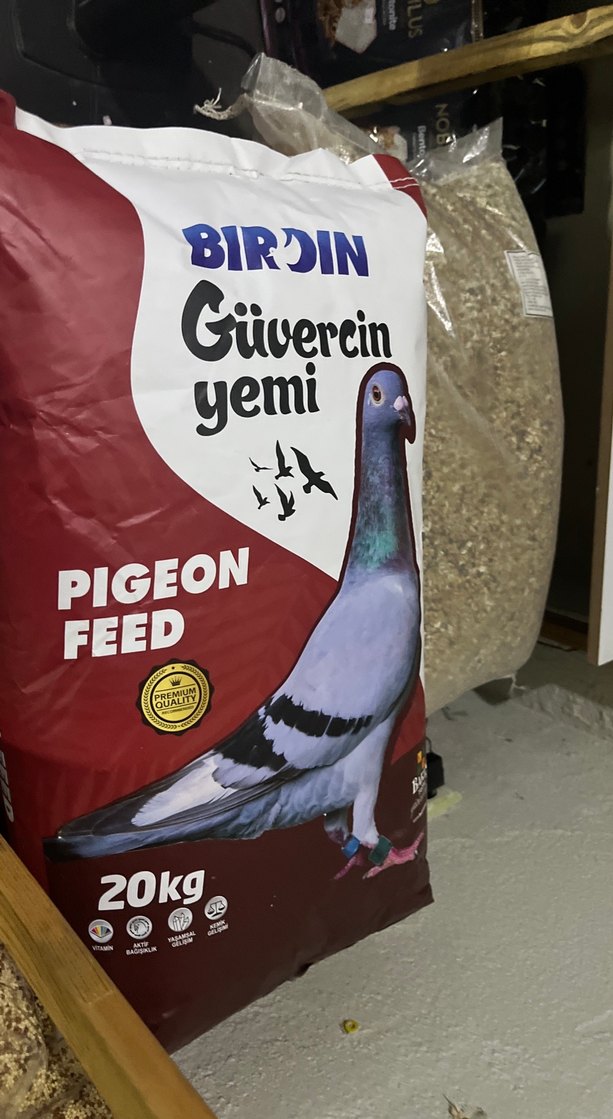 BIRDIN güvercin yemi 20kg ağırlığında, parlak gri renkte paketlenmiş. Güvercinler için dengeli beslenme sağlar. ️
