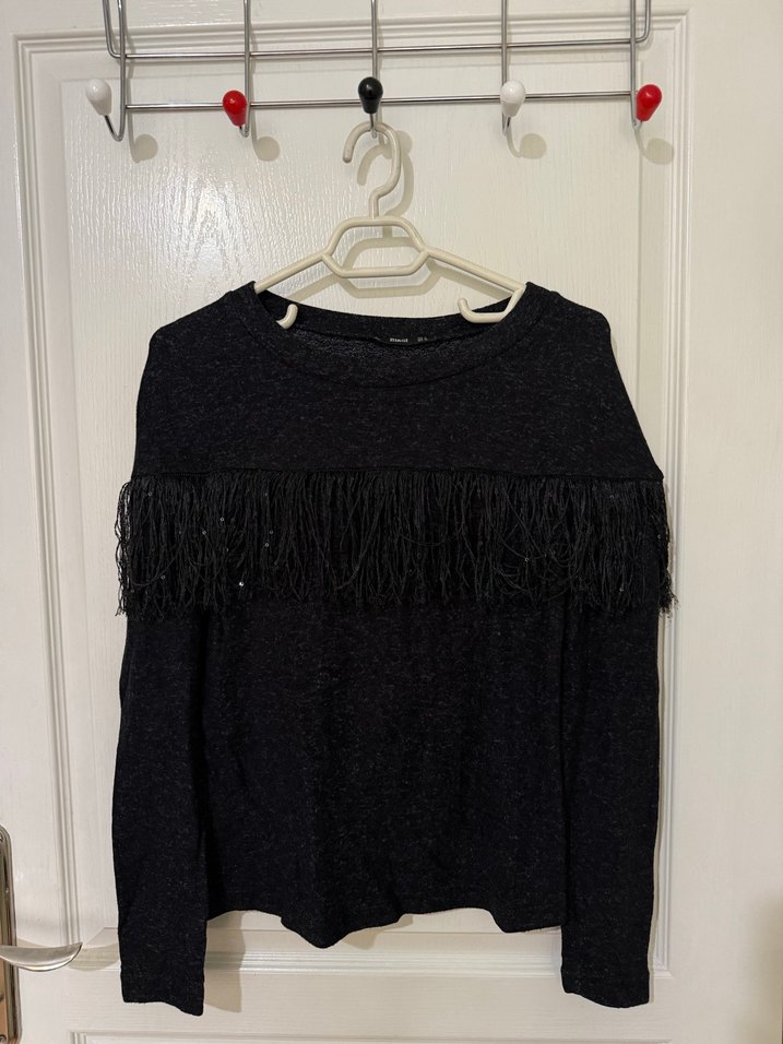 Siyah triko kumaştan, uzun kollu, yuvarlak yakalı ve bol kesim kadın kazak. Göğüs kısmında püskül detayları vardır, rahat ve günlük kullanım için uygundur.