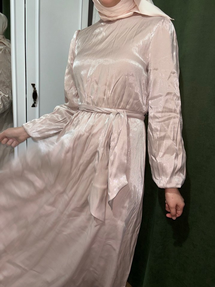 ürün pudra renktir. ışıltılı kumaştır. astarlıdır. boynu için gül aksesuarı vardır takılıp çıkarılabilir.