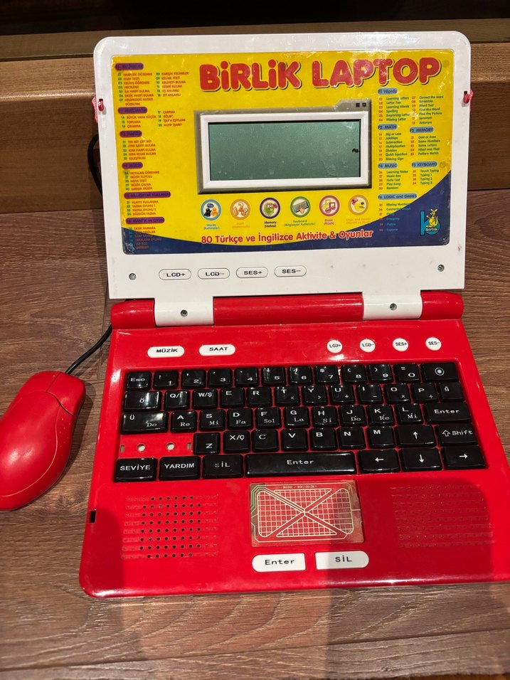 Kırmızı renkli, 80 Türkçe ve İngilizce etkinlik içeren eğitici oyuncak laptop. Klavye, ekran ve fare ile interaktif öğrenme sağlar. Sesli, müzikli, egitici oyun, yazı, bulmaca ve 80 farklı içeriğiyle muhteşem bir ürün. Alın ve cofugunuzu sevindirin. 3 kalem pille çalışıyor.