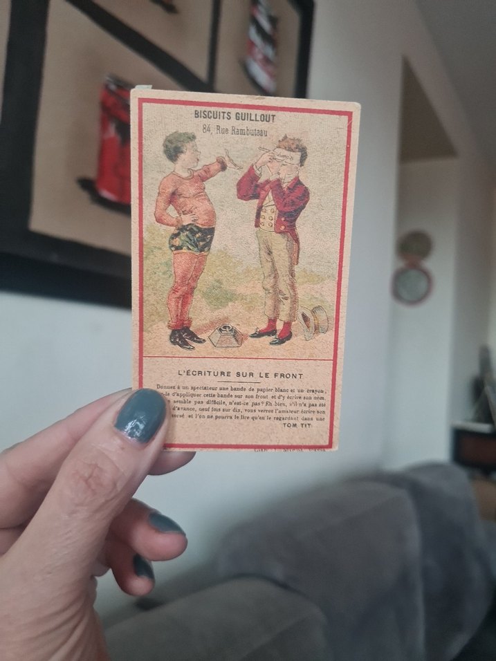 ️ Biscuits Guillout – “L’Exquis Guillout” Reklam Kartı Paris, 1898–1902 Paris’te 84 Rue Rambuteau adresinde faaliyet gösteren Biscuits Guillout’ya ait, renkli taş baskı reklam kartı. Ön yüzde mizahi bir illüstrasyon, arka yüzde ise markanın o dönem için yeni ürünü: “Nouveau dessert praliné au chocolat.” Dönemin reklam dili, kağıt kalitesi ve tipografisiyle çok karakterli bir parça. Ephemera, Fransız reklam tarihi ve eski ambalaj / tanıtım materyali koleksiyoncuları için güzel bir örnek. Küçük ama hikâyesi büyük bir Paris hatırası.