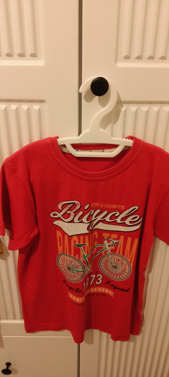 Kırmızı pamuk kumaştan, bisiklet baskılı ve zincir detaylı, kısa kollu, bisiklet yaka, bohem tarzında erkek tişörtü.3 adet fiyatı, Marka temsili 6/7 yaş için uygun herhangi bir sorunu yok