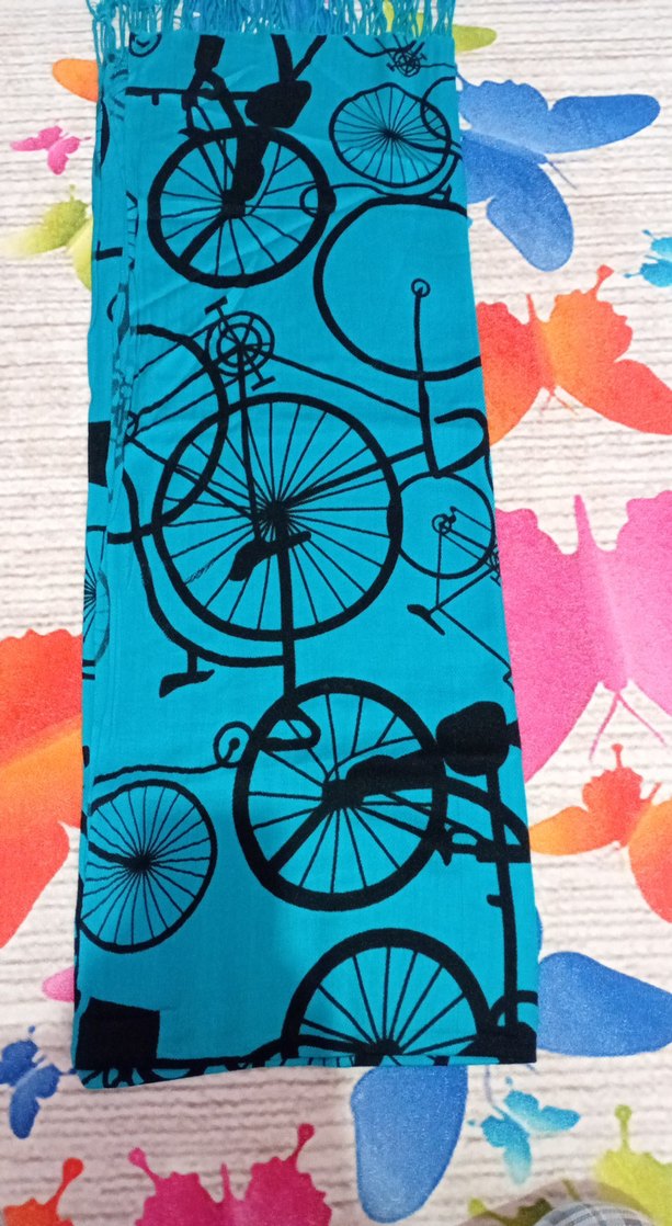 Yumuşak kumaştan, canlı bisiklet desenli renkli şal.
