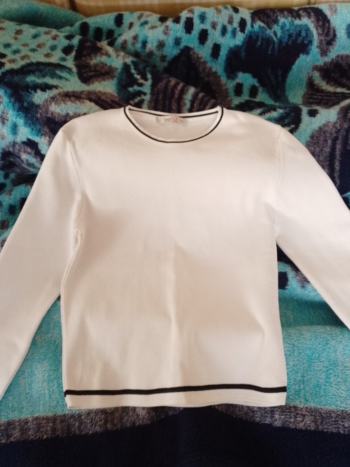 Yakası ve bilekleri siyah çizgili, ince kumaş sade ve şık.