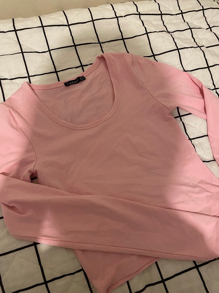 Pembe tonlarında, uzun kollu ve bisiklet yaka, vücuda oturan kadın tişörtü. Pürüzsüz sentetik kumaştan, günlük kullanıma uygun sade bir tasarım.