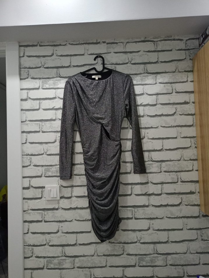 Parlak sentetik dar elbisedir uzun kollu bisiklet yaka yanlardan büzgülü gri renk. karın bölgesi dekoltelidir. parti düğün gece mekanları için uygun bir abiyedir.