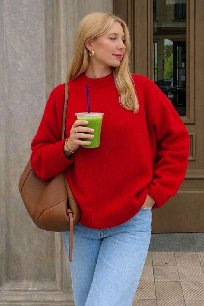 Bisiklet Yaka Kırmızı Oversize Triko Kazak
