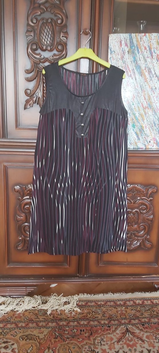 Kolsuz. Gevşek kesim ve koyu mor batik desenlidir, günlük kullanım için uygundur. Suni deri görünümlü yakası var Kol altı ön 48.cm Boy 94 cm. Ön roba : deri takliti(ince deri gibi duruyor siyah Elbiseye siyah hakim / desenlidir Hiç giyilmedi