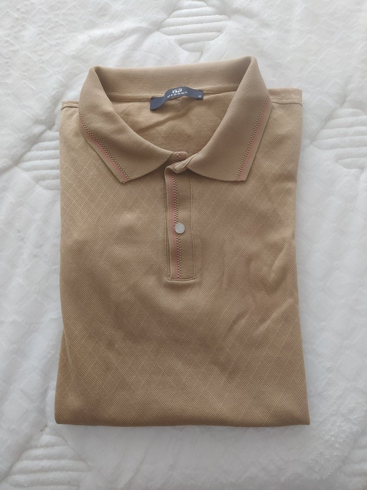 Bej renk, düğmeli yakalı kısa kollu polo tişört. Sentetik kumaştan, regular fit ve pastel tonlarda, günlük sokak stiline uygun.