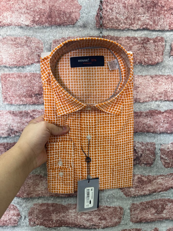 Turuncu renkli, desenli, uzun kollu, düğmeli ve yakalı erkek gömleği. Pamuklu kumaştan, normal boyda ve spor kesimlidir. Ofis ve günlük sokak stiline uygundur. Bisse orijinal üründür. Tek adettir. Kampanyalıdır.