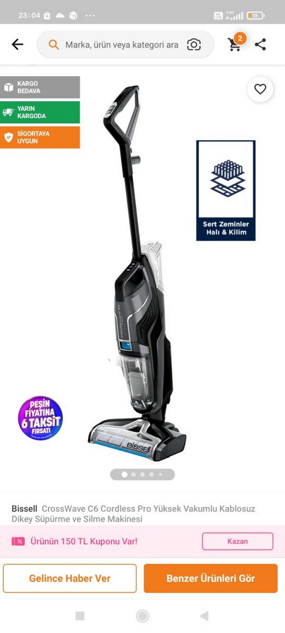 Bissell CrossWave C6, sert zeminler, halı ve kilimlerde kullanılabilen kablosuz yüksek vakumlu süpürgedir. Güçlü emiş ve pratik temizlik sağlar. 160 m2 ev için kullanışlı olmadi. islak yer silme için almıştık. ürün güzel ama bizim için dip köşe temizlemedigi icin kullanamıyorum günlük temizlik icin uygun .