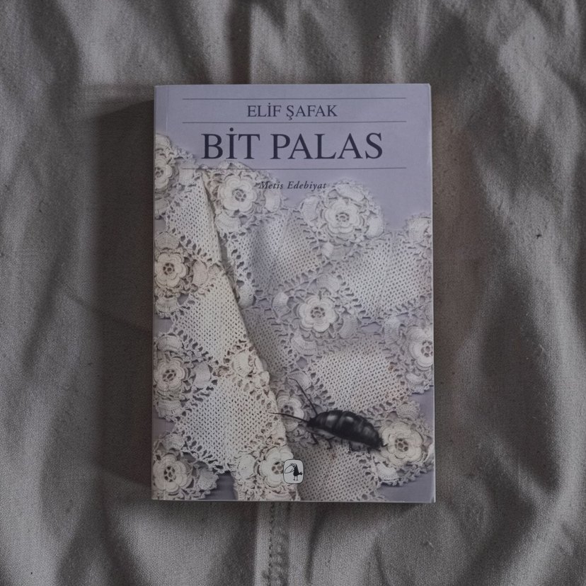 Elif Şafak'ın "Bit Palas" adlı romanı, detaylı anlatımı ve zengin kültürel öğeleriyle dikkat çekiyor. Kapakta ince dantel desenleri ve bir böcek resmi yer alıyor.