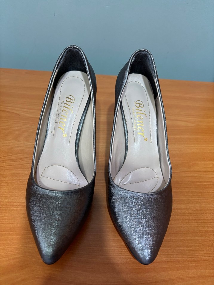 Parlak yılan desenli, gri renkte, kauçuk malzemeden yapılmış stiletto topuklu ayakkabılar. Modern klasik ofis stiline uygun.