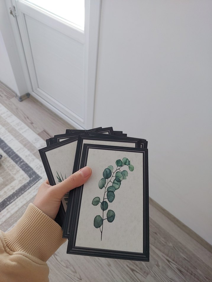 Yeşil yapraklı botanik çizimlerin yer aldığı sanat kartları seti. Sanatseverler için ideal.