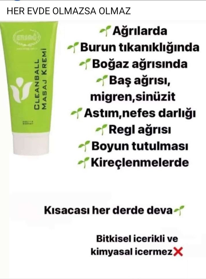 Kimyasal içermeyen, bitkisel içerikli Cleanball masaj kremi. Ağrılar, burun tıkanıklığı, boğaz ağrısı, baş ağrısı, migren, sinüzit, astım, nefes darlığı, regl ağrısı, boyun tutulması ve kireçlenmelerde etkilidir.