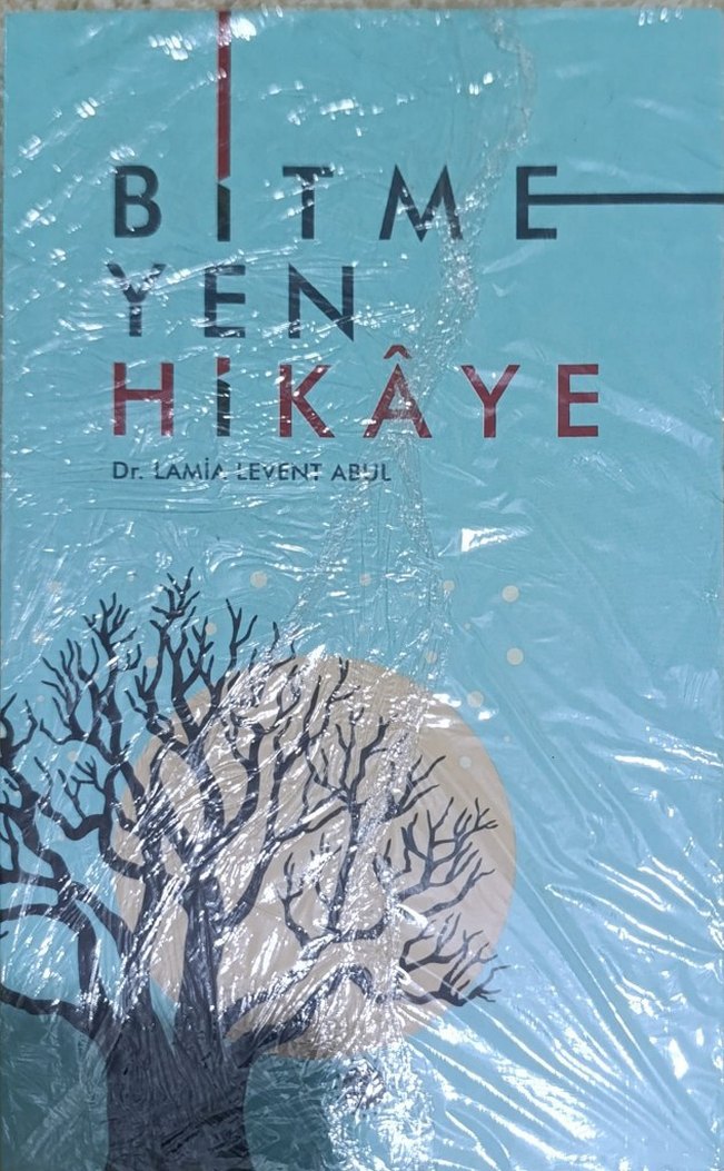 Dr. Lamiyevemt Abjl'in "Bitmeyen Hikaye" adlı şiir kitabı, kalıcı hikayeleri şiirlerle anlatıyor. Kapağında ağaç ve büyük ay figürü bulunur.