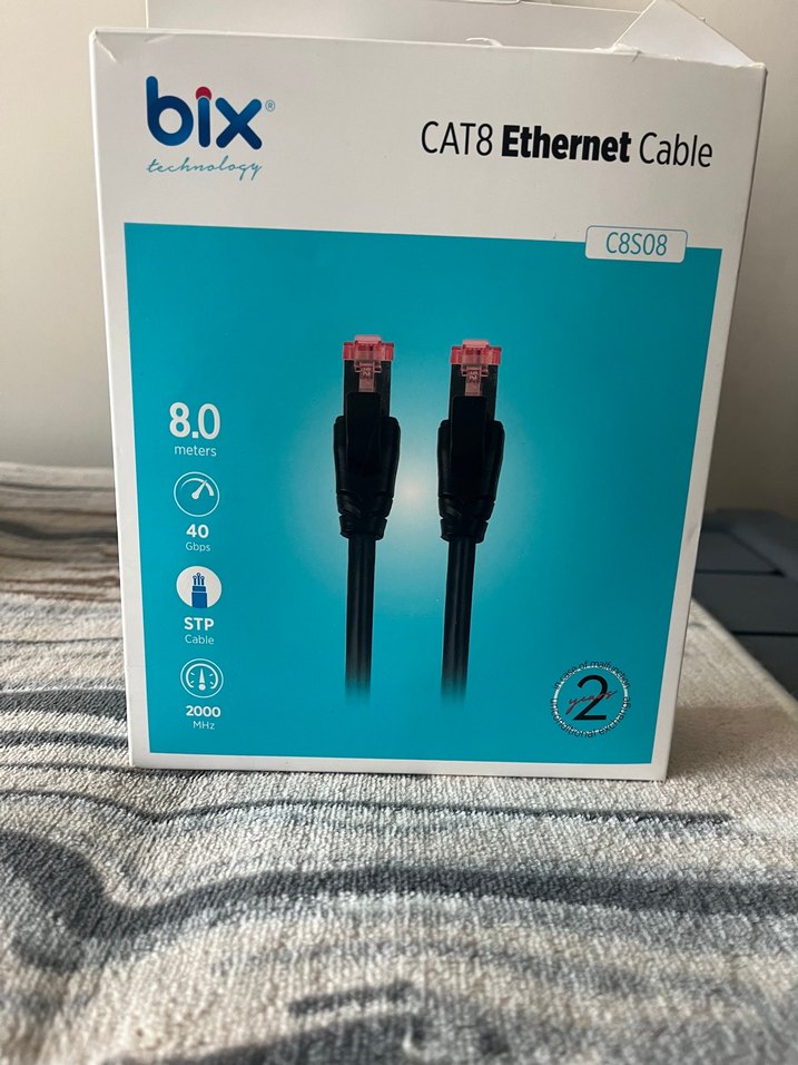 Bix CAT8 Ethernet kablosu 8 metre uzunluğunda, 40Gbps hıza ve 2000 MHz frekansa sahiptir. STP korumalı kablo, yüksek hızlı veri iletimi sağlar.