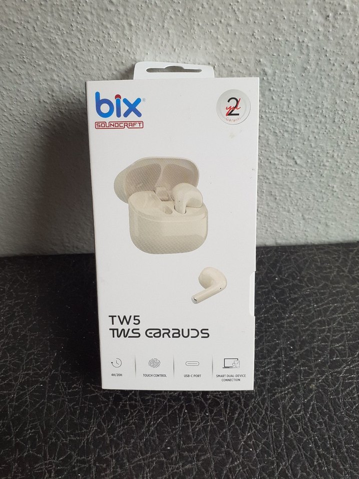 Bix TW5 beyaz kablosuz kulaklık, dokunmatik kontrol ve çift mikrofon özellikleriyle net ses ve kolay cihaz bağlantısı sunar.