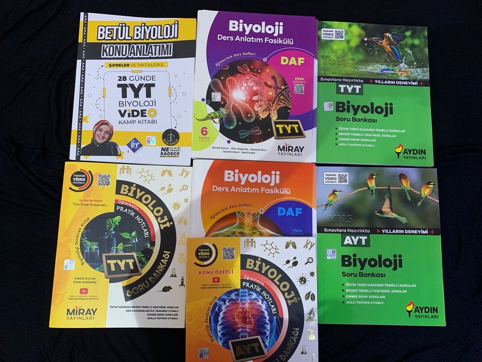 TYT ve AYT biyoloji sınavlarına yönelik video destekli ders anlatım fasikülleri, konu özetleri ve pratik notlar içeren soru bankası seti. Her yayından bulunur temizdir adet fiyatı 50-120 arasında değişir profilimden ayrıntılarına bakıp alabilirsiniz