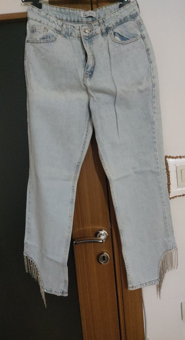 Buz mavi renkli, taşlı, paça yırtmaçlı ve taş püskül detaylı kadın denim jean. günlük kullanıma uygun sade tasarım.