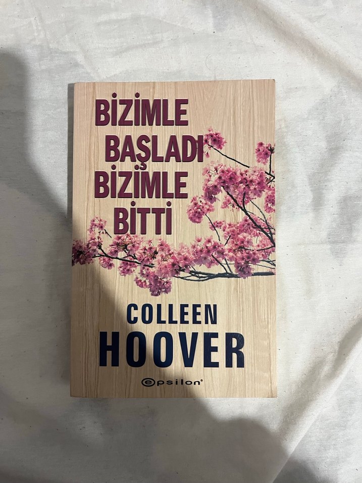 Colleen Hoover'un "Bizimle Başladı Bizimle Bitti" adlı romanı, kiraz çiçeği dallarıyla kaplanmış bir kapağa sahip. Yayınevi Opsilon.