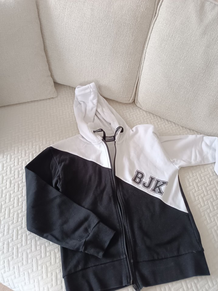 Kapüşonlu, fermuarlı ve uzun kollu bu erkek çocuk sweatshirtü, yumuşak kumaştan ve siyah-beyaz renk bloklu tasarıma sahip. Üzerinde BJK baskısı bulunur.