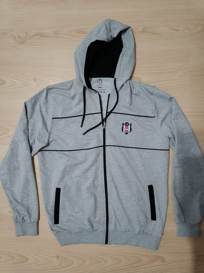 Gri renkli, kapüşonlu erkek sweatshirt. Uzun kollu, fermuarlı. hiç giyilmedi.