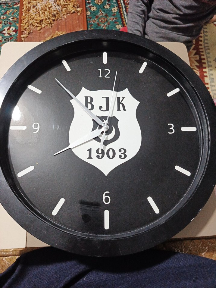 Siyah zemin üzerinde BJK amblemi bulunan, 6, 12, 3 ve 9 rakamları belirgin siyah duvar saati. Beyaz saat işaretleriyle sade tasarım