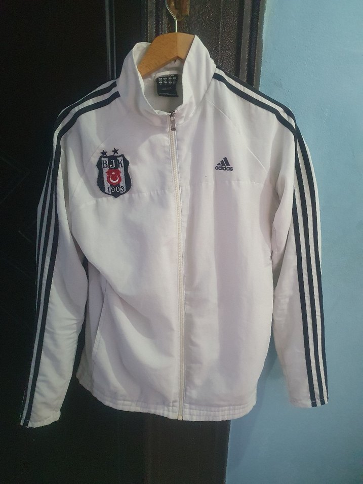Beyaz Adidas spor ceketi, fermuarlı ön, uzun kollarda siyah şeritler ve Beşiktaş baskılı amblem içerir. Yumuşak kumaştan üretilmiş, sportif ve günlük kullanıma uygundur. ⚽