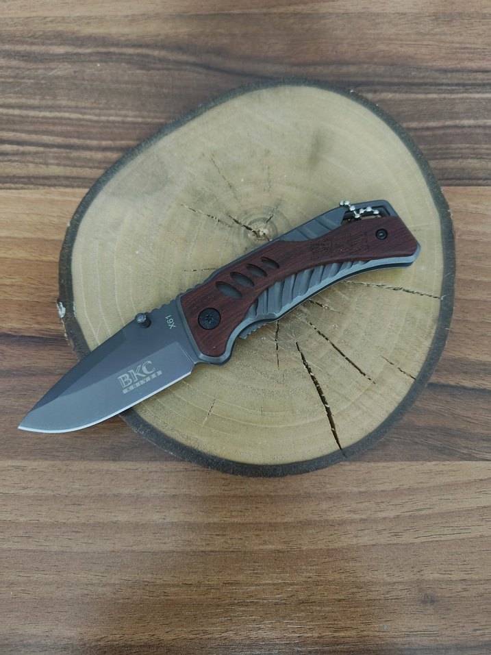 Koyu kahverengi katlanabilir bıçak, sağlam bir bıçak ve ergonomik tutma yeri ile metal ve ahşap dokularını bir arada sunar. ️