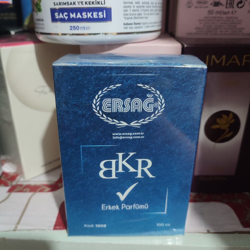 BKR ERSAG erkek parfümü, parlak mavi kutuda klasik tarzda, 100 ml. Üzerinde Türkçe yazılar ve 1008 kodu bulunur.