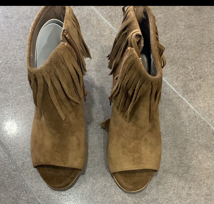 Kahverengi süet dolgu topuklu botlar, püskül detaylarıyla bohem tarzını yansıtıyor. Desensiz, rahat ve retro bir görünüm sunar.