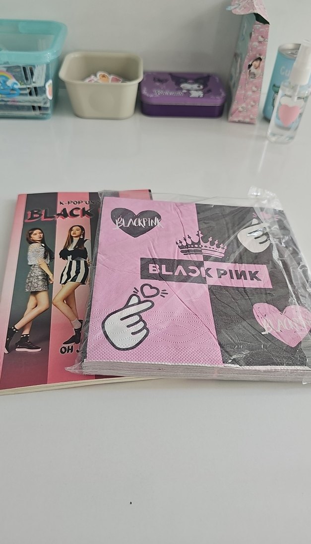 BLACKPINK temalı dergi ve pembe-siyah desenli peçete seti, kalp ve logo detayları içerir.