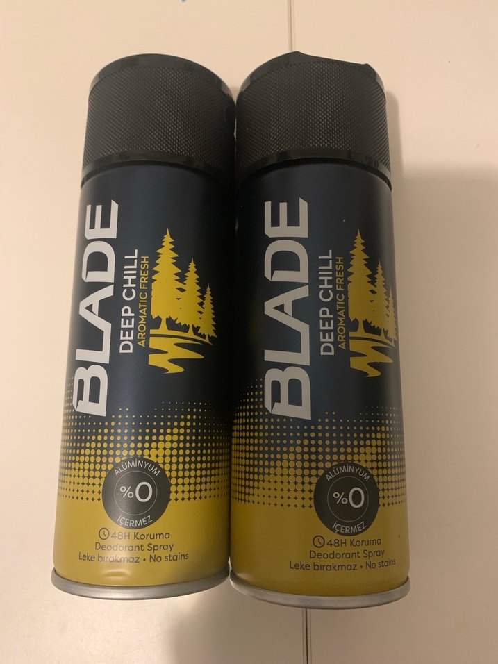 Blade Deep Chill erkek deodorant spreyi, 48 saat koruma sağlar, leke bırakmaz ve alüminyum içermez. Sokak stiline uygun koyu sarı tasarıma sahiptir.