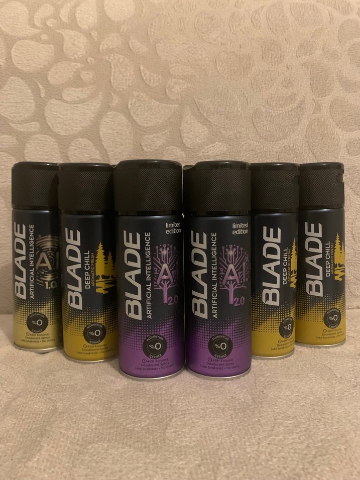 Blade markalı erkek deodorant roll-onlar, koyu mor ve siyah ambalajda, karşı kültür ve grunge punk tarzında. Sınırlı sayıda, yapay zeka temalı.