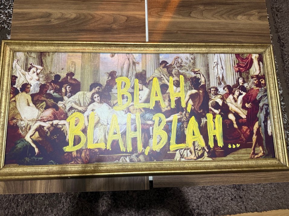 'BLAH BLAH BLAH' adlı sanat, klasik bir tablo arka planı ve sarı büyük harflerle yazılmış modern bir tipografi içerir.