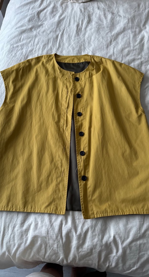 Sarı keten, düğmeli, kolsuz, yuvarlak yaka, rahat kesim kadın yeleği. Günlük kullanıma uygun. Bir kez giyildi