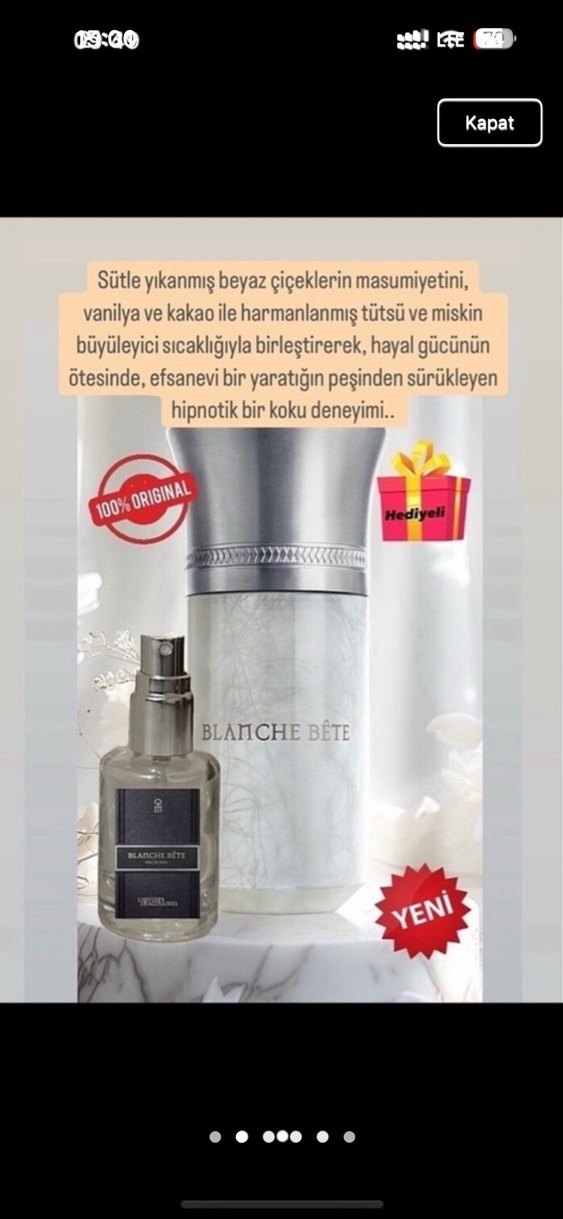Orijinal şişesinden 10 ml. spreyli cam şişeye aktarılmış şekildedir, iade yoktur. 20-30-50 ml. istekleriniz için ilan açtırabilirsiniz. Blanche Bête kadın parfümü, vanilya, kakao, sütle yıkanmış beyaz çiçekler, tütün ve miskin büyüleyici sıcaklığıyla hipnotik bir koku deneyimi sunar.