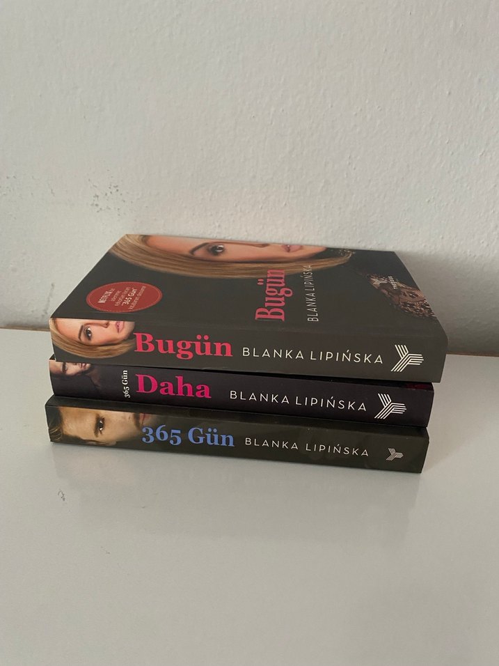 Blanka Lipińska'nın 'Bugün,' 'Daha' ve '365 Gün' adlı üç romanından oluşan set. Her kitabın kapak tasarımı farklıdır.