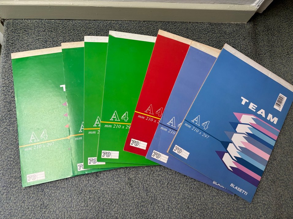 Blasetti Team A4 boyutunda (210x297 mm) renkli kalem kapaklı defterler. Her biri 70 sayfa içerir, okul için uygundur. Blasetti marka TEAM serisi A4 boy 7 adet çizgili not defteri. Hiç kullanılmamış, tertemiz durumdadır. Kapakları renkli ve şık tasarımlıdır. Okul, ofis ve koleksiyon için uygundur. Toplu satılmaktadır. Tane fiyatı : 150 • #notdefteri #a4defter #teamdefter #kırtasiye #koleksiyonluk #blasetti #sıfırürün