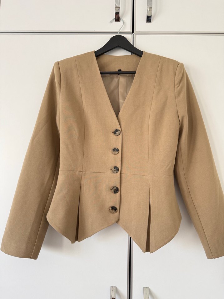 Trendyolmilla Bej keten kumaştan yapılmış, düğmeli ve klasik modern tarzda kadın blazer.