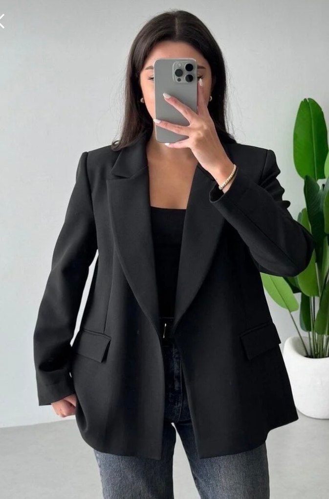 Siyah renkli, notched lapel yakalı ve uzun kollu kadın blazer ceket. Sentetik kumaştan, normal kesim ve desensiz tasarım, ofis için şık ve rahat bir seçenek.