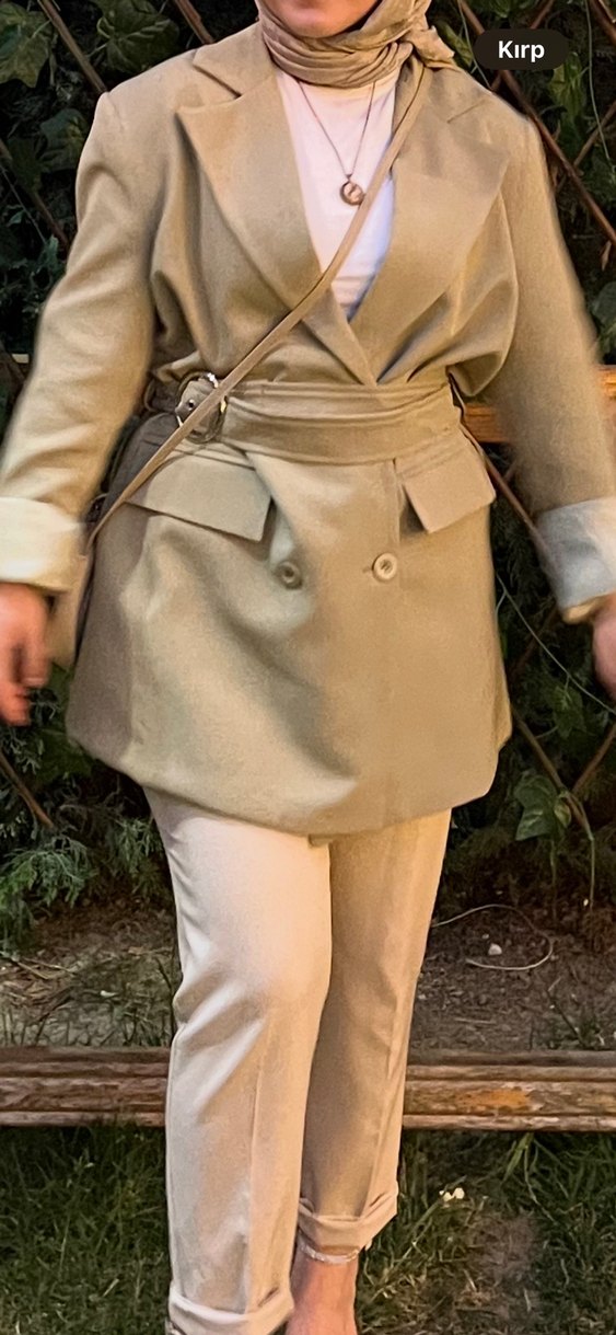 Yağ yeşili renkli kemerli ve normal boy midi kadın blazer ceket