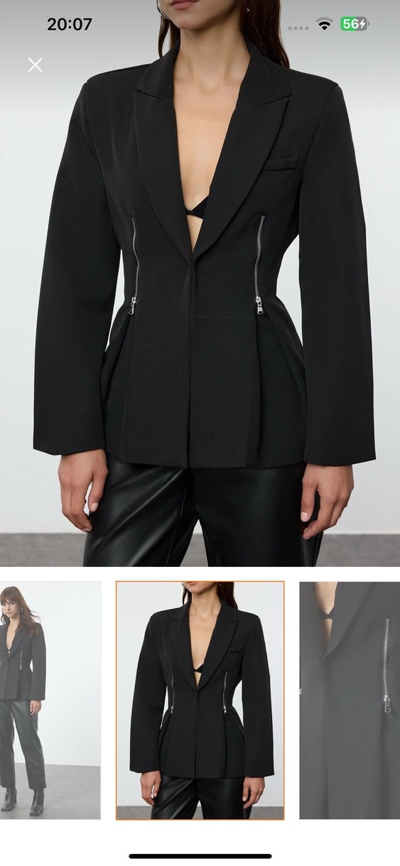 Kadın siyah blazer, kesik yaka, uzun kollu ve fermuarlı detaylara sahip. Ofis için uygun, midi boy ve regular fit. bele oturan