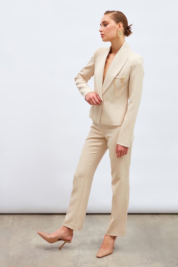Bej renkli, yaka detaylı, uzun kollu kadın blazeri, ipeksi kumaştan üretilmiştir. Normal kesim ve midi boyda, ofis için uygundur. ✨ • Marka: Saten • Renk: Bej • Model: Broş detaylı kısa ceket • Şık ve zarif kesim • Broş çıkarılmıştır, istenirse tekrar takılabilir • Tok ve kaliteli kumaş • Elbise, etek ve pantolonlarla kolay kombinlenir • Davet, özel gün ve şık kombinler için ideal • Çok temiz / az kullanılmış • Leke, yırtık veya deformasyon yok