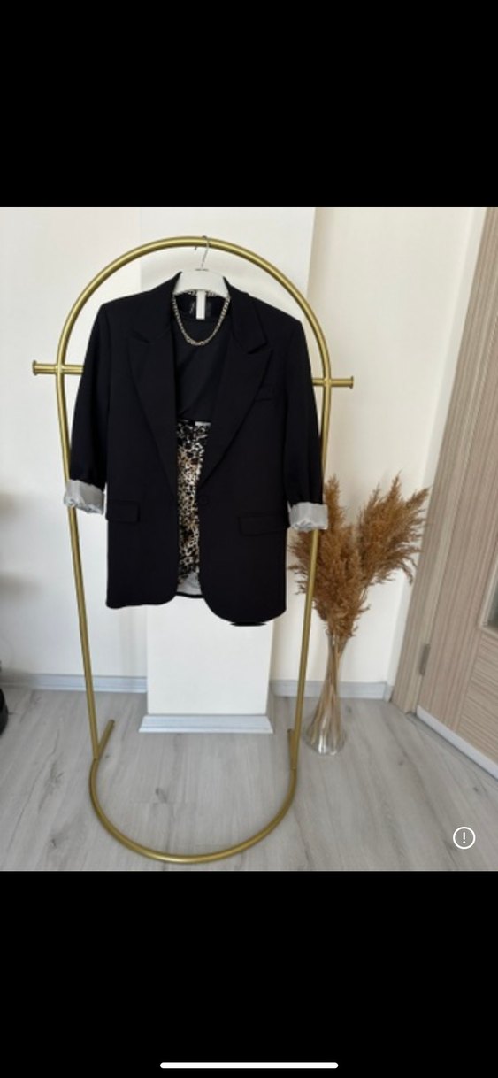 Uzun kesim siyah blazer, uzun kollu.Ofis için modern şık bir parça