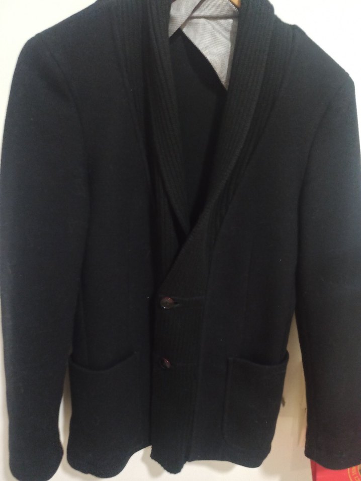 Blazer ceket Düğmeli, siyah yün unisex ceket, klasik kesim ve normal boyda. Notched lapel yakalı, uzun kollu, ofis kullanımı için uygun.