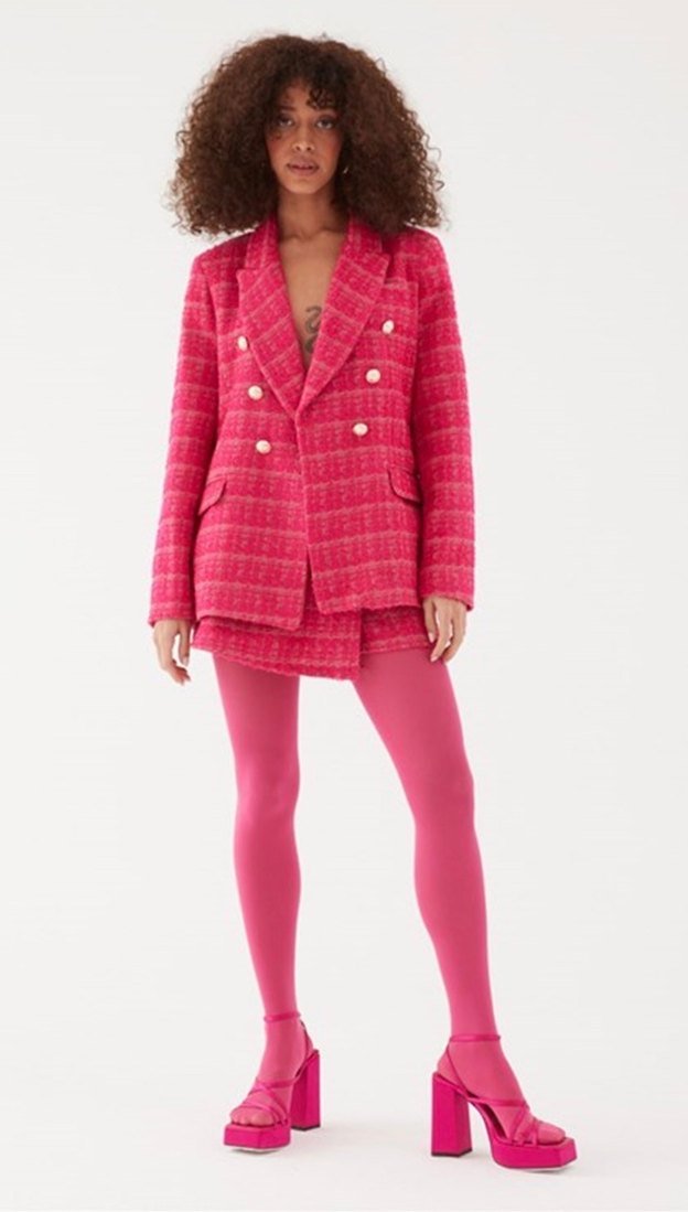 Fuşya düğmeli blazer ceket ve şort etek takımı, deformesi yoktur Ceket M etek S bedendir. Fiyat konusunda yardımcı olabilirim.